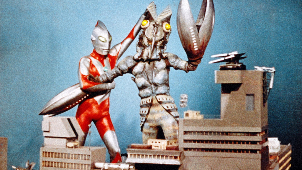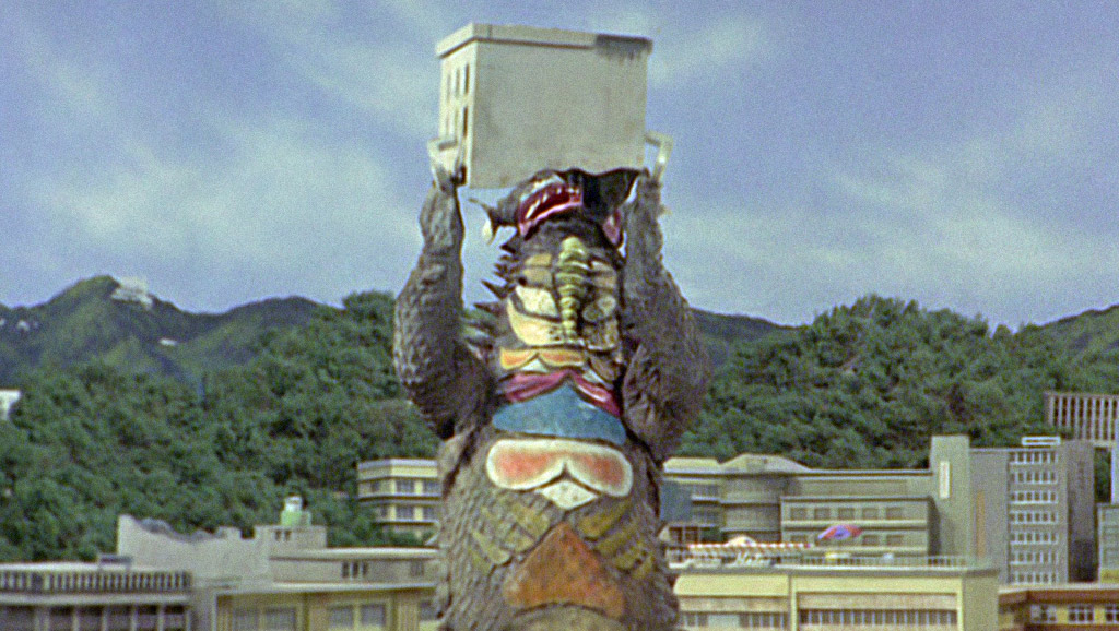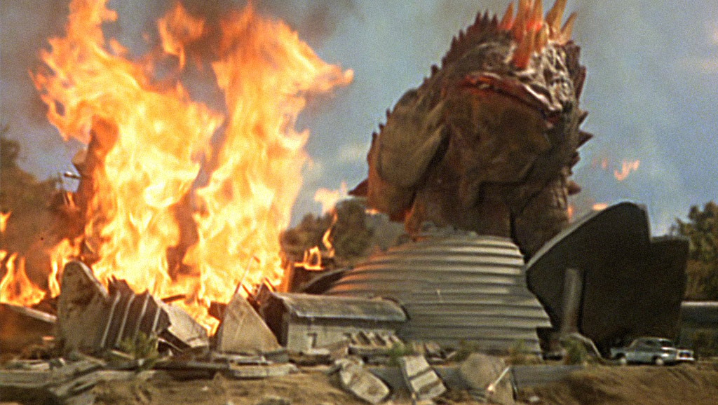 怪獣が街に現れて大暴れし、ビルや倉庫、橋脚など