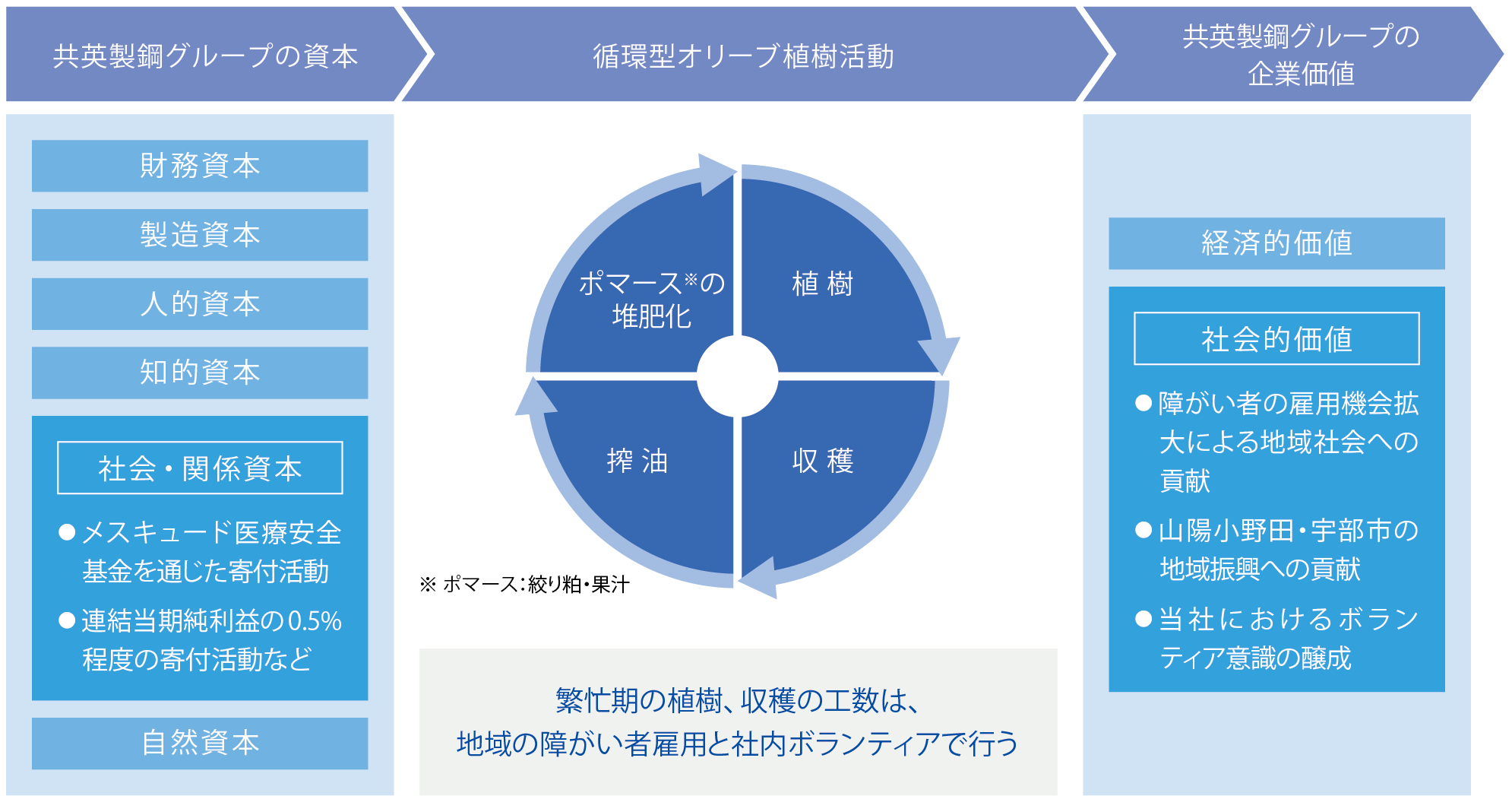 当社グループのオリーブ植樹活動は、社会・関係資本を投じて社会的責任を果たし、当社グループの社会的価値を高めることを目的としています。連結純利益の0.5%程度の範囲で、地域や社会に役立つ寄付を行うだけでなく、障がい者雇用や地域振興に貢献できる活動を通じて社会からの大きな信頼を獲得したいと考えています。