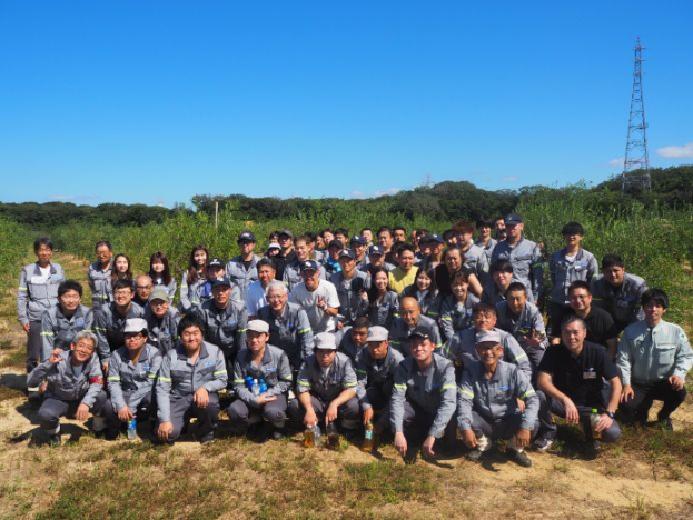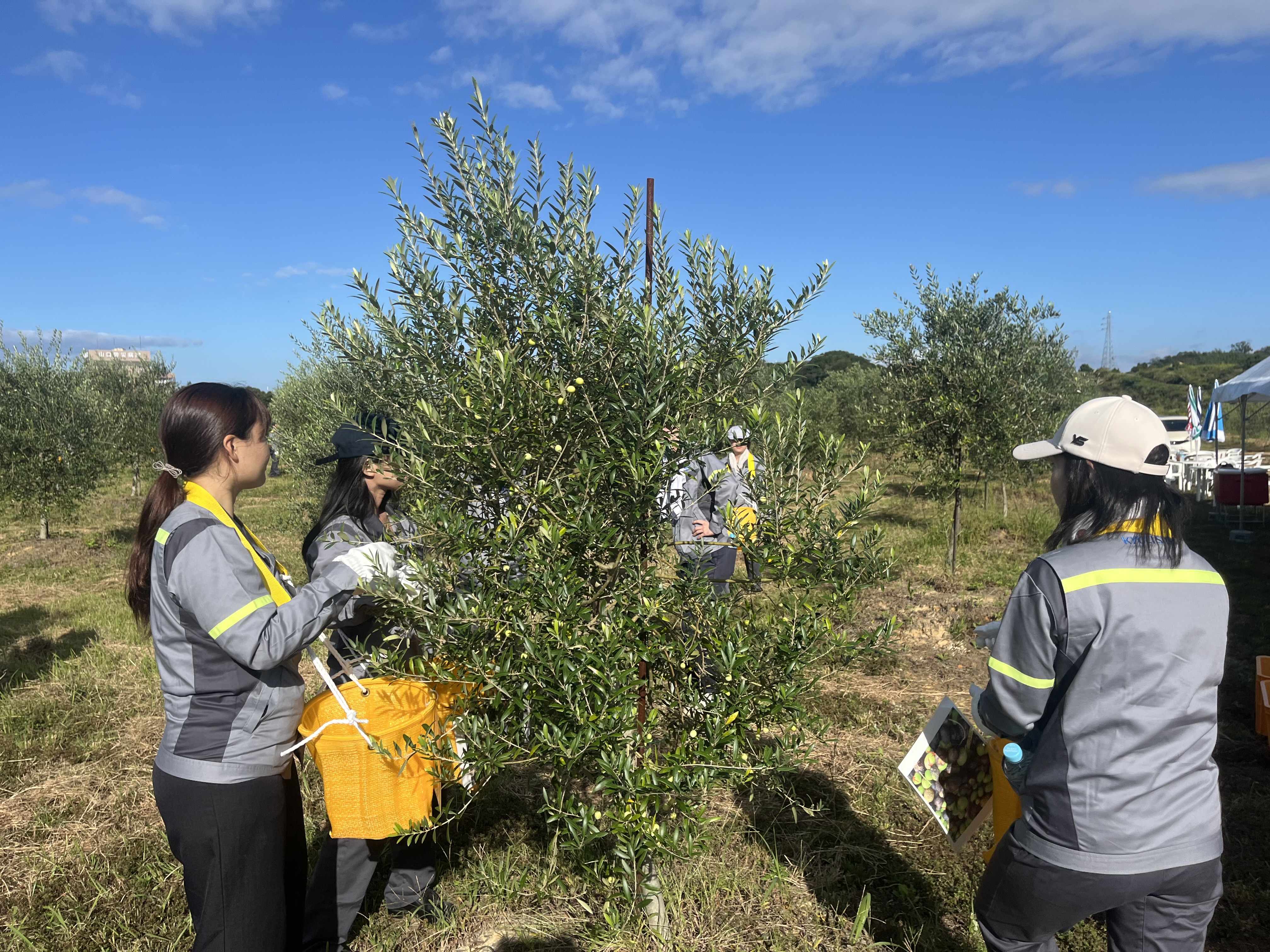 当日は秋晴れのもと、本社・事業所・子会社など全国の拠点に加え、山陽小野田市社会福祉事業団指定障害福祉サービス事業所まつば園の方々にもご協力いただき、総勢80名が参加しました。和やかな雰囲気の中、手作業での摘み取りと選別作業を行いました。収穫されたオリーブは、今後オリーブオイルに加工される予定です。